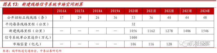 3)按照不同项目的定制需求实际的单公里造价有所差异,目前信号系统的单公里造价大约为800-1200万元/公里,以中位值造价1000万元/公里计算,2020-2024年市场空间分别为106亿元、116亿元、128亿元、141亿元、155亿元。