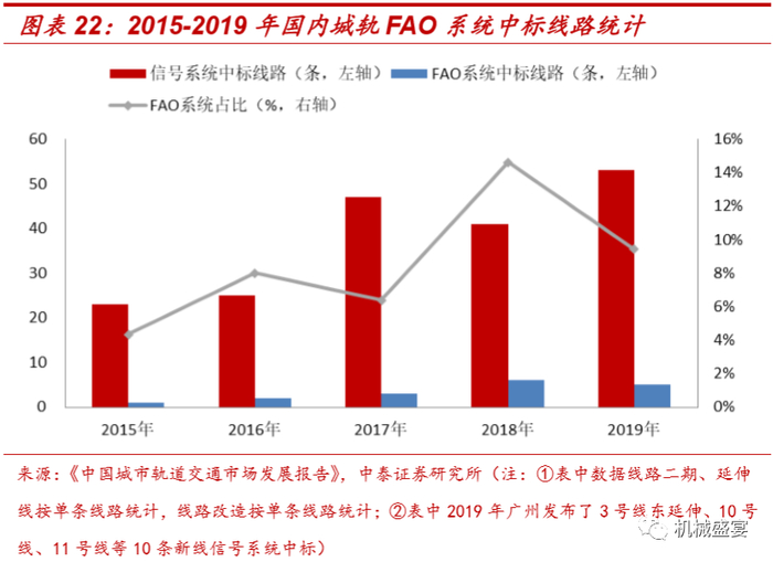 FAO系统在国内城轨领域的应用已得到逐步推广。2010年,国内首条FAO系统在上海的10号线(35.2km)应用,为阿尔斯通技术;同期,广州建设了从庞巴迪引进技术的3.9公里APM线;2017年交控科技的FAO系统在北京燕房线(16.6km)开通,是我国第一条全自主技术的全自动运行线路,达到了轨道交通领域最高自动化等级GoA4级,代表了世界先进水平。2015-2019年,国内城轨信号系统共有189条线路中标,其中FAO系统中标线路共有17条,占比达8.99%。