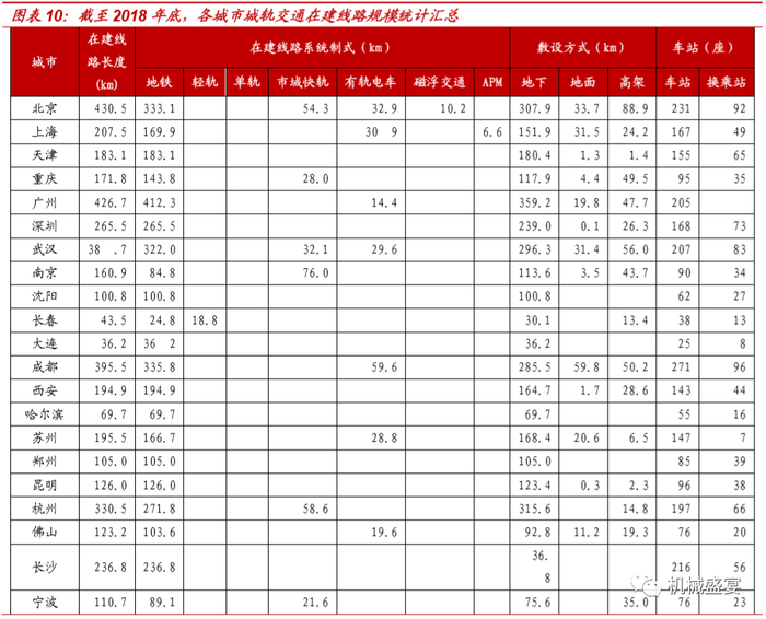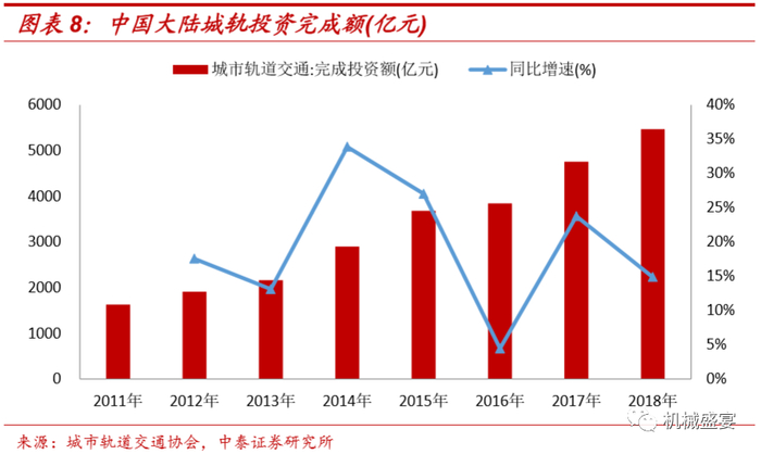 ②我国城轨投资快速增长。2018年,中国大陆共完成城轨建设投资5470.2亿元,同比增长14.9%;截至2018年底,在建线路总长6374公里,可研批复投资额累计4.27万亿元,城轨发展前景广阔。