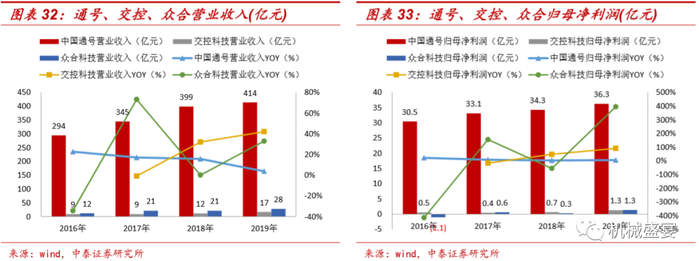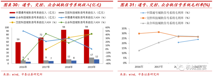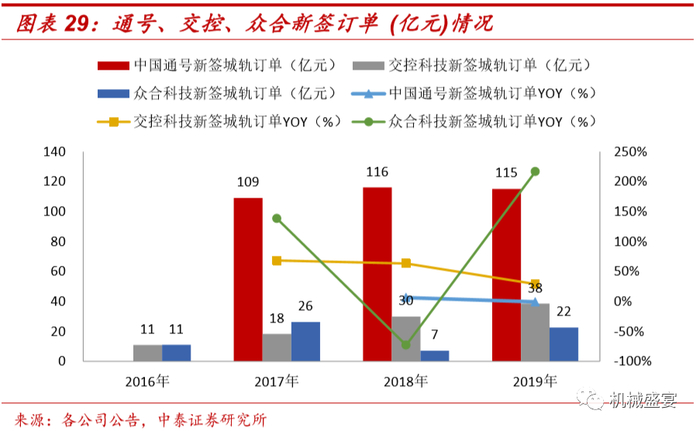从公司城轨业务业绩来看,中国通号收入体量最大,交控科技、众合科技收入增速较快、毛利率较高。2019年,中国通号城轨业务收入为94.35亿元,同比增长0.80%,毛利率为23.98%,同比增加3.09pct;交控科技城轨业务收入为16.52亿元,同比增长42.09%,毛利率为26.66%,同比减少0.27pct;众合科技城轨业务收入为11.61亿元,同比增长42.39%,毛利率为26.97%,同比减少0.67pct。中国通号收入体量大,收入增速低于交控科技、众合科技,交控科技、众合科技发展势头更为迅猛。