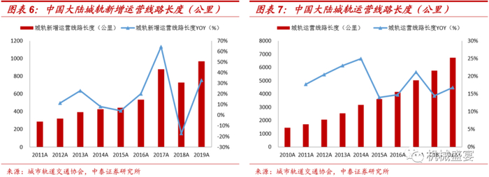 ③我国城轨线路排名世界第一。2019年,中国大陆新增城轨运营里程968.77公里,同比增长32.96%,再创历史新高。截至2019年底,中国大陆城轨运营里程为6730.27公里,占全球总里程23.92%,排名世界第一。