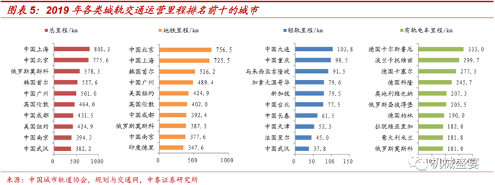 4)从城市层面上看,全球共80座城市的城轨交通运营总里程超过100km,其中中国有18座城市;共19座城市总里程超过300km,其中中国有8座城市;上海、北京、莫斯科、广州、首尔的总里程超过500km,其中上海以801.34km运营里程居世界第一,成都首次跻身全球前十,并超越了纽约、南京和武汉。