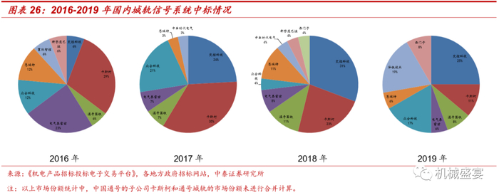 3)公司继续保持市场领先地位。2019年,公司共中标9条新线路(含改造),开拓6个新城市,市场占有率为25%,连续两年位列第一。2019年,公司完成合同签订新增总金额38.45亿元,同比增长28.98%;其中信号系统工程项目新增合同签订总金额34.17亿元(含2018年中标项目在2019年签订合同5.29亿元)。