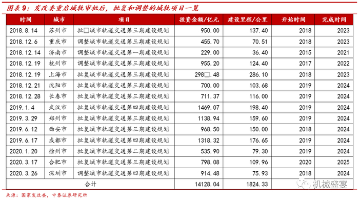 1)2017年8月,由于包头地铁停工事件和中央金融会议、经济会议的防范地方系统性债务风险要求,国家发改委曾一度暂停了城市轨道交通建设规划审批工作;2018年8月,国家发改委重启审批,正式批复《苏州市城市轨道交通第三期建设规划(2018~2023年)》;截至2020年3月底,发改委已批复和调整14个城市的城市轨道交通建设规划,合计投资金额超1.4万亿元。