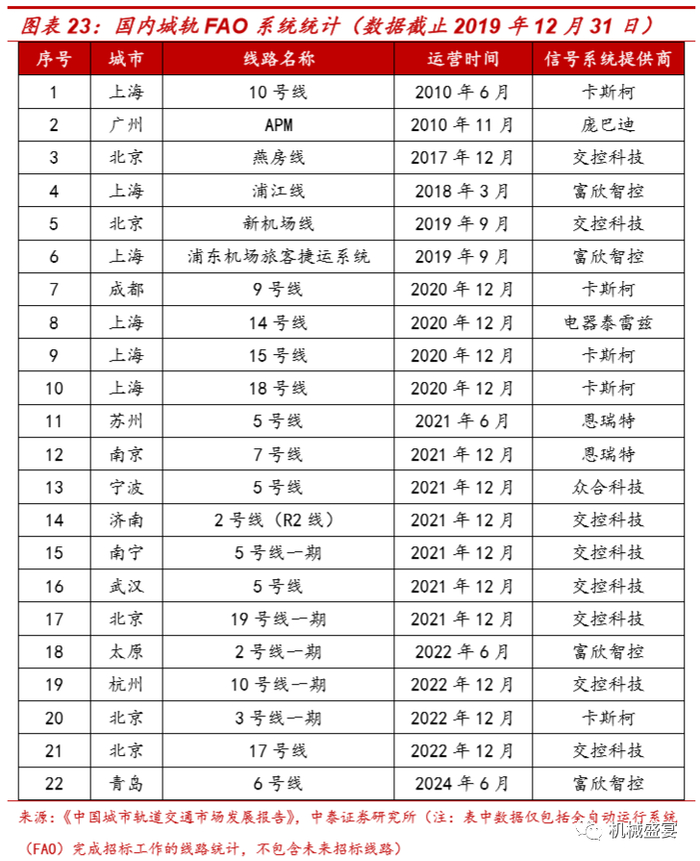 3)交控科技于2017年实现FAO产品的工程应用,卡斯柯、通号城轨、电气泰雷兹均有中标自主FAO产品,但目前尚未开通。