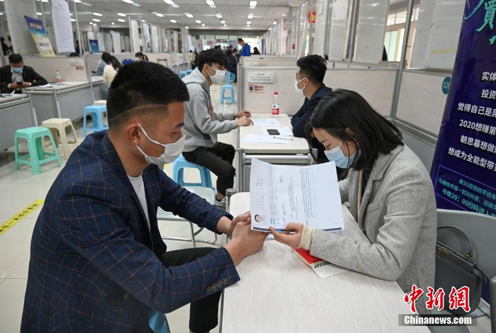 4月14日,浙江杭州,招聘会上招聘者在查看求职者简历。 中新社记者 王刚 摄