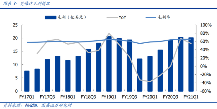 1.Q1营收超出市场预期,毛利率创近年新高:Q1收入为30.8亿美元(市场预期29.92亿美元),同比增长39%,环比下降约1%,同比实现大幅增长主要归功于数据中心和游戏业务增长强劲。毛利率为65.1%,为17年以来最高水平;实现净利润9.17亿美元,同比增长133%,环比下降3%;运营费用为10.3亿美元;非GAAP每股收益为1.80美元,同比增长105%。
