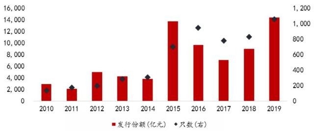 根据中国证券投资基金业协会官网,下图为近10年公募基金发行数量与份额。