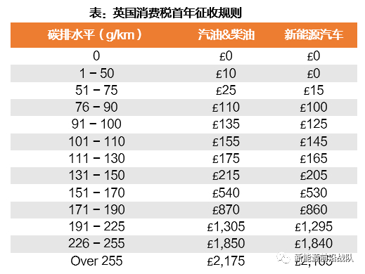 消费税:针对所有车,按年征收,一共征收5年。BEV减免所有年份的车辆消费税。燃油车购车首年基于碳排放水平征收,其他年份消费税均为150英镑。若汽车价格超过4万英镑,则每年加征325英镑的车辆消费税。