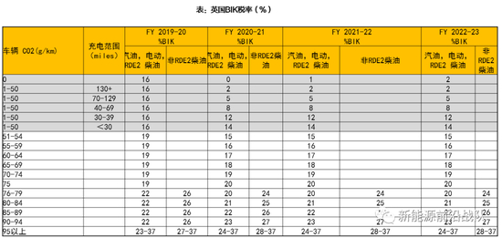 英国:BIK税率与二氧化碳排放量有关,且近些年处于变动中,燃油车年税率范围大部分在20%-37%。