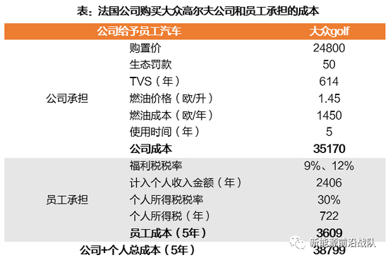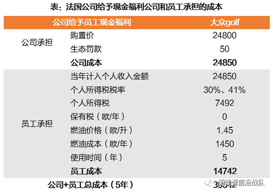 法国:假设该员工年收入5万欧,税率30%。该公司车使用时间为5年以内,由公司支付燃油费。