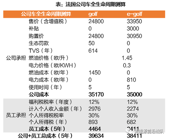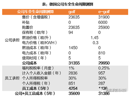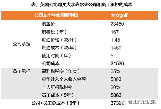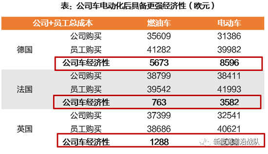 公司车在燃油车领域较私人购买具备经济性。1)德国:可使公司+员工总成本减少5673欧;2)法国:可使公司+员工成本减少763欧;3)英国:可使公司+员工总成本减少1288欧。