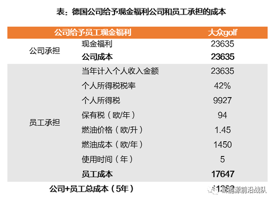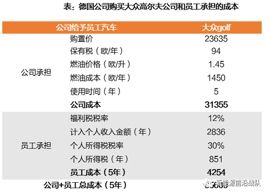 以大众高尔夫为例,公司给予员工汽车VS同等价值货币,测算两种情况下公司和员工承担的成本。