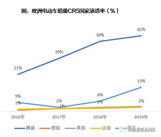 欧洲电动车销量CR5集中度在70%-80%,2019年CR5销量分别为:德国(10.88万辆)、挪威(7.97万辆)、英国(7.28万辆)、荷兰(7.15万辆)、法国(6.14万辆)。