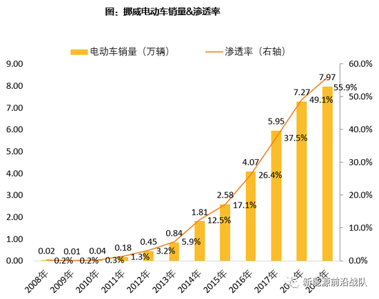 挪威自2011年开始免征电动车增值税,随着2015年后电池价格快速下降,使得电动车具备购置经济性,挪威电动车渗透率5年突破50%。