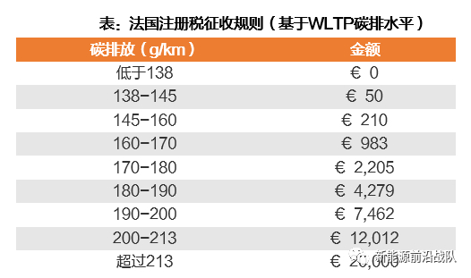 生态罚款:针对所有车,购置时一次性缴纳,根据碳排放征收(BEV无碳排放,得以免征),高污染车辆(碳排大于190g/km)往后每年仍需缴纳160欧元罚款。2020年3月1日起,碳排标准由NEDC改为WLTP,较2019年更为严格。以雷诺畅销车辆Clio汽油车为例,其NEDC碳排105g/km,而WLTP碳排134g/km,2019年不罚款,2020年罚款50欧元。