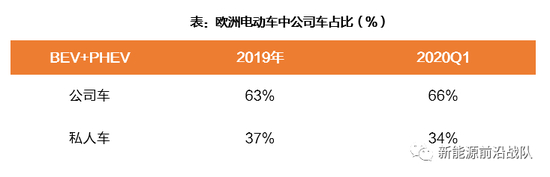 在电动车领域,公司车占比更高,原因在于欧洲多国有针对公司电动车的BIK福利税的减免政策。2019年、2020Q1公司车占比分别为63%、66%,高于燃油车54%。故推测公司车电动化后可带来更强的公司车经济性,即公司购买电动车比燃油车,较私人购买成本节约得更多。