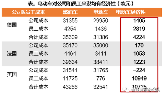 分主体看:1)对公司来说,购买电动车在德法可节省成本1405、170欧;2)对员工来说,购买电动车在德法英可节省成本2819、1053、10949欧。