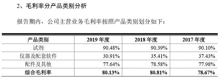 在高净利率的背后,新产业的收入结构其实并不复杂,2019年16.82亿元的销售收入中,试剂收入占比为78.8%,仪器机器配套软件收入占比为16.3%,余下收入为配件及其他。