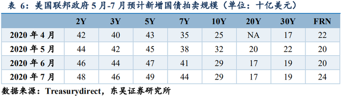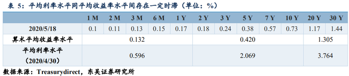 如果我们把表4中不同期限区间的(联邦政府实际负担的)平均利率水平同我们常用来衡量联邦政府的收益率曲线相等期限区间的平均收益率水平作比较的话,我们能观察到一定程度的时滞(存量平均利率滞后于增量平均利率):如果货币政策处于加息周期,后者往往大于前者;如果货币政策处于降息周期,前者则往往大于后者,我们当前处于后一种情况之中,也就是联邦政府的融资成本比市场“当前”认为的水平要高一些。通过债务滚动,低息债券的增量不断地稀释掉相对高息的存量,这种分歧会逐渐消弭;根据鲍威尔前期表态所声明的:“美国将保持利率在0水平,直到度过危机”,我们有理由认为(1)联邦政府实际支付的各期限区间债务的平均利率水平还将进一步向一级拍卖、二级交易的边际市场定价水平靠拢;(2)联邦政府为了在未来加息周期来临时,仍可持续利用当前超低息环境,正在加大T-notes和T-bonds的融资规模,从近期重启20年期国债融资,5-7月规模达到540亿美元来看也可窥一斑。