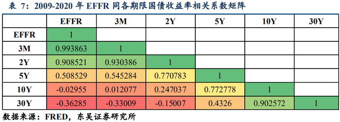 联储EFFR这只“看得见的手”只能控制收益率曲线短端,中长端需要其它工具。(1)近乎完美控制联邦政府短期融资成本。同3月期国债收益率相关系数达到0.99;(2)通过控制EFFR进而控制联邦政府中期融资成本存在一定压力。同2年期国债收益率相关系数达到0.91;同5年期国债收益率相关系数仅为0.51;(3)通过控制EFFR进而控制联邦政府长期融资成本几无可能。同10年期国债收益率相关系数为-0.03;同30年期国债收益率相关系数为-0.36。联储需要另一只“手”。