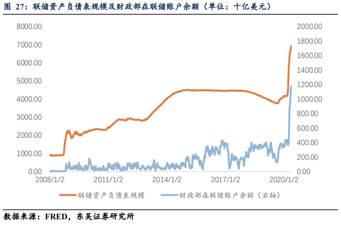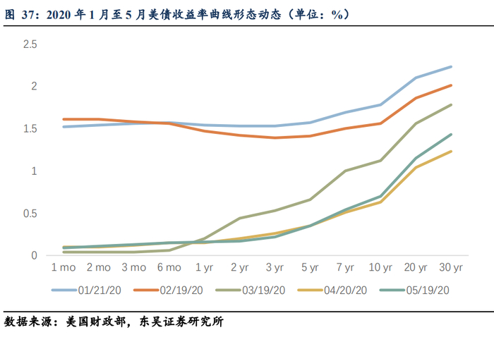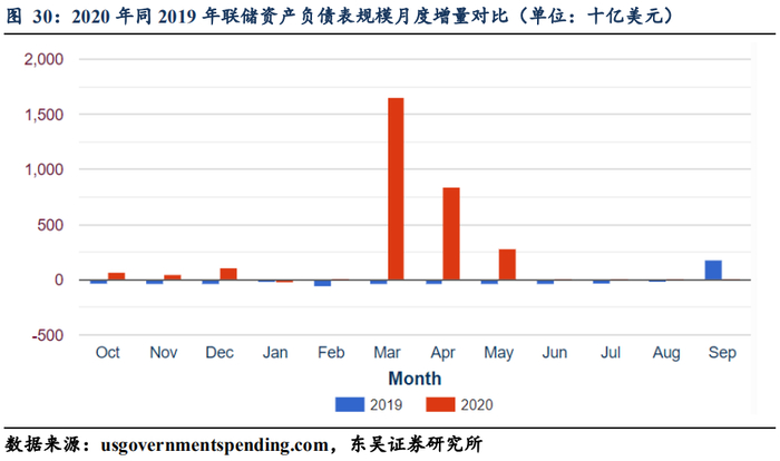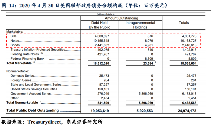 在前期报告《如何理解美联储接下来的政策空间?(上)》,我们曾经把2020年5月的联储资产负债表的分项同2019年5月做同期比对,联储在扩表的2.8万亿规模中,T-bills扩表规模占到3269亿美元,占比11.52%,而T-notes和T-bonds合计扩表规模占到1.4万美元,占比50.32%。