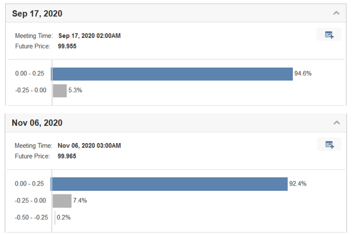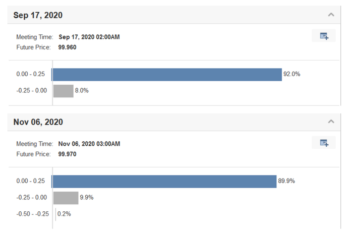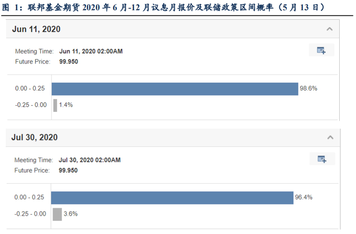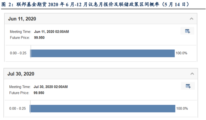 联邦基金期货2020年6月至12月的合约报价相应出现一些戏剧性变化:6月、7月施行NIRP的概率降低到零,9月、11月、12月施行NIRP的概率不降反升(参见图1,图2)。市场彷佛认为联储这是在嘴硬,嘴硬得了一时,但到了2020年底还是要松口,“绥靖”预期(就像之前一而再、再而三发生过的那般)。市场对NIRP的预期很难说是降温了,这也提供给我们了一个充足的空间,来讨论联储接下来政策工具的选择问题。