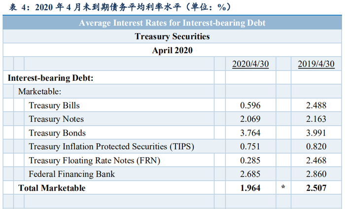 正如前文所述,利息支出=Σ(T_i)(r_i),也就是由国债余额的期限结构(T_i)以及各期限的要求收益率(r_i)直接相关。进一步观察2020年4月30日最新公布的美国联邦政府债务余额的构成情况以及平均利率水平:(1)联邦政府的债务大体上分为可在二级市场转让的(marketable),和不可以的(nonmarketable),分别占比约为3/4和1/4;(2)从可转让的负债期限结构来看,T-bills(1年期以下)约4万亿美元,占比21.59%;T-notes(2,3,5,10年期)约10万亿美元,占比54.83%,T-bonds(10年期以上)约2.5万亿美元,占比13.20%;(3)对比2019年4月30日同最新公布的2020年4月30日的各利率区间的平均利率水平来做观察,T-bills平均利率水平从2.488%下降到0.596%,T-notes从2.163%下降到2.069%,T-bonds从3.991%下降到3.764%,包括TIPS、FRN、FFB所有品类的可转让联邦政府债券的平均利率水平都出现不同程度的下降。经过不断地稀释,可转让债务整体的平均利率水平1年间从2.507%下降到1.964%(不包含TIPS以及FRN)。