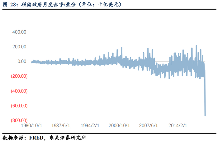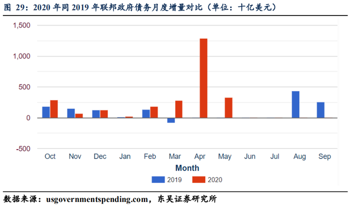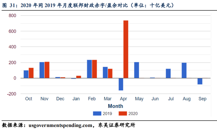 联邦财政情况的“劣化”至今是空前的,联储的态度是如何的呢?鲍威尔在前期北京时间5月14日发表声明的时候一方面虽然表示负利率不是美联储所关注的,但同时也表示美国第二季度GDP可能“很容易”达到萎缩20%-30%的程度;疫情后美国的经济实力将依赖于保持家庭的偿付能力;企业和家庭可能需要“3-6个月”的更多财政援助,以避免破产;“失业率峰值为20%-25%”的预测大致正确;有关6月份失业率上升的基准预测情景是合理的。这意味着鲍威尔当前认为未来3-6个月财政大概率还将持续保持空前的扩张姿态(结合今年作为大选年,鲍威尔认为的3-6个月其实也就是基本到大选结果落锤的11月份,联邦财政的扩张大概率都会保持一个同比差异较大的趋向)。