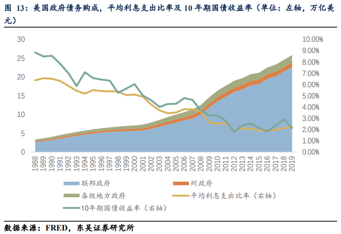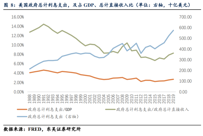 我们首先来观察一个粗略的指标,即政府总计利息支出/政府总计直接收入。根据FRED提供的从1988年至今约30年间的数据来看,峰值14.45%出现在1991年,之后逐步下行,谷值6.7%出现在2015年,之后由于利息支出增速超过政府总计直接收入增速,2019年达到8.27%。这里我们需要理解的是,同美国近30年间的数据进行比较的话,8.27%的水平并不高,甚至偏低;原因在于(1)媒体往往强调美国政府债务和利息支出的上升,而不强调美国政府财税收入的同步上升(并不是由于平均税率的上升,而是由于总量的上升);(2)媒体往往更强调美国政府债务存量这个变量,而相对忽略利息支出这一变量。