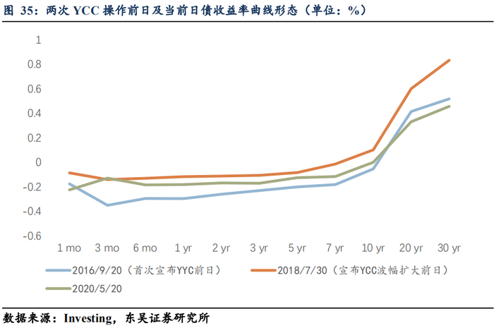其次,日央行在首次施行YCC的时候面临的情况有四个特征:(1)10年期国债收益率在2016年2月施行了NIRP后延续下行态势,于2016年7月达到-0.28%,1月期、3月期、6月期、1年期、2年期、3年期、5年期、7年期收益率曲线短中端全部下沉到零点以下;(2)虽然于2016年2月施行了NIRP,但到了9月份日央行面临的整条收益率曲线变得异常平缓,局部出现倒挂,金融体系整体的盈利面受到来自(a)NIRP;(b)期限利差收窄;(c)借贷利差收窄的三重打击,下行压力较大;(3)虽然于2016年2月施行了NIRP,但并没有遏制日元从2015年中期启动的升值趋势,至2016年9月日元累计升值幅度达到20%(从125日元/美元下降到100日元/美元);(4)日央行资产负债表规模持续扩大;我们有理由认为这四个特征其中的一个或多个促使日央行最终决议施行YCC。