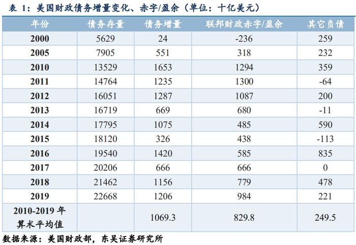(1)债务存量的边际变化(基本上)等于财政赤字/盈余的累加。这里我们严格意义上说“基本上”是因为联邦政府举债的规模往往要大于财政赤字的规模。比如,2019年联邦财政赤字虽然仅为9840亿美元,但债务增量却达到1.2万亿美元。