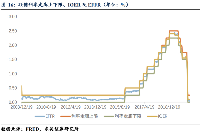 正如我们在前期报告《浅谈IOER的角色及联储“再扩表”的目的》中所表述的,联储的首要政策性操作标的:有效联邦基金利率(Effective federal fund rate, EFFR),通过IOER及ON RRP设置的“有效”利率走廊上下限来进行夹逼,当前EFFR稳定维持在0.04-0.05%。