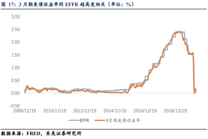 (1)近乎完美控制联邦政府短期融资成本。EFFR同3月期国债收益率(简称3M)超高度相关,相关系数达到0.99;我们即使不去探讨货币市场同存准金市场之间的密切关系,也可以意识到一定存在某种形态的无套利条件,使得EFFR同3M几乎无时无刻不同方向运动;3M-EFFR的符号未必一定保持正或负;当思考因果关系时,3M往往对市场关于联储操作的预期更加敏感,所以3M往往先于EFFR有所动作,比如2020年2月下旬时,3M-EFFR仅-4BPs,到了3月中旬时,3M-EFFR迅速扩大到-74BPs,非常明显的“倒挂”,之后到了4月下旬时,3M-EFFR才恢复到了7BPS较正常的区间;某种意义上来说,联储需要通过调节EFFR来“适应(accommodate)”3M这一货币市场利率,消除“倒挂”;另外,3M作为T-bills的代表性利率,新陈代谢速率较快,鉴于我们同样对其它T-bills(占可转让联邦债务余额22%)收益率进行了相关性分析,我们有足够的理由认为联储“仅”通过控制EFFR,就可以“几乎”完美地控制联邦政府的短期融资成本。