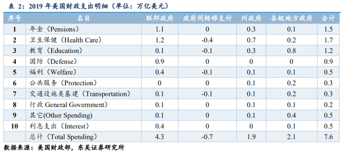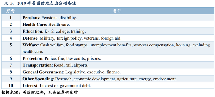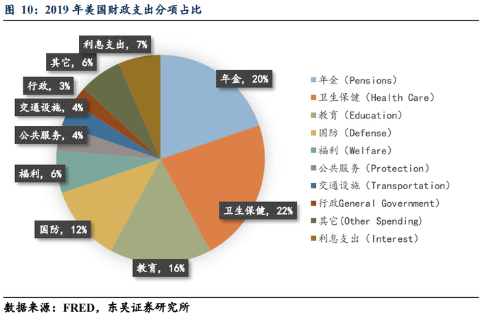 (2)针对2019年美国财政支出分项来做观察的话,我们可以看到在美国政府合计支出中年金、卫生保健与福利(卫生保健由于占比较大,所以单独列出)、教育、国防为大头,而利息支出作为分项相对占比较小。