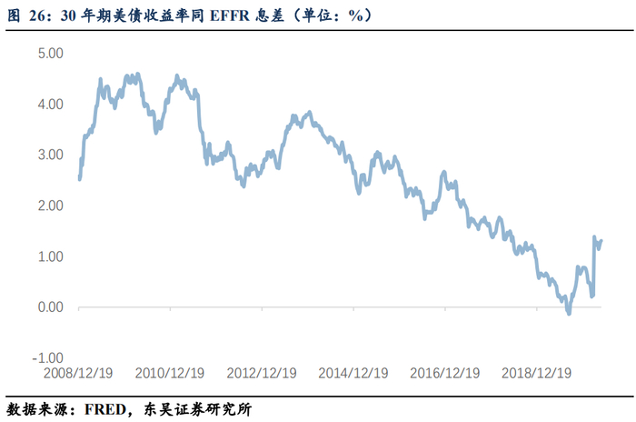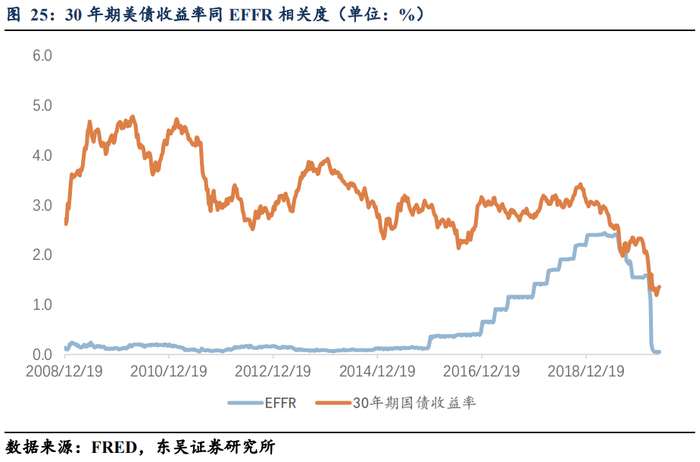 (3)通过控制EFFR进而控制联邦政府长期融资成本几无可能。EFFR同10年期国债收益率(简称10Y)几乎不存在任何的相关关系,相关系数为-0.03;同30年期国债收益率(简称30Y)甚至出现了较弱的负相关关系,相关系数为-0.36;注意我们的采样还仅包括2008年次贷危机之后的这个扩张期,由于众所周知地在2000-2008年的扩张期中所谓的“格林斯潘之谜”的问题,如果采样区间扩展到2000年以来,相关系数或会更加趋负(尤其是同10Y的关系);另一个值得注意的是,10Y同30Y之间非常强烈的相关性,相关系数达到0.90(同时10Y同5Y的相关系数也达到0.77);这意味着联储通过控制EFFR来控制T-bonds的10Y和30Y几无可能,控制联邦政府的长期融资成本必须通过其它的政策性工具。