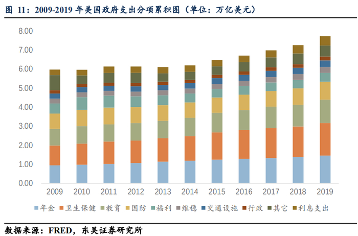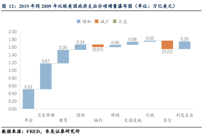 (3)进一步分析从2009年至2019年,美国政府总计支出增加了1.73万亿美元,参照瀑布图可以清晰地看到,分项增量中年金贡献0.51万亿,卫生保健贡献0.67万亿,教育贡献0.35万亿,而利息支出只贡献了0.2万亿,贡献占比仅略超1成。