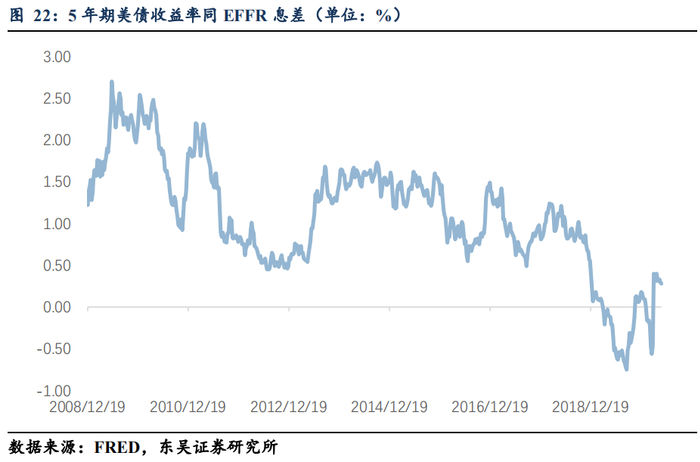 (2)通过控制EFFR进而控制联邦政府中期融资成本存在一定压力。EFFR同2年期国债收益率(简称2Y)相关度也非常高,相关系数达到0.91;EFFR同5年期国债收益率(简称5Y)相关度弱一些,相关系数仅为0.51;值得注意的是联储加息过程中2Y-EFFR和5Y-EFFR往往都大于零,联储降息过程中2Y-EFFR和5Y-EFFR往往更接近零,或者小于零;同3M-EFFR相比,2Y-EFFR和5Y-EFFR对EFFR的牵引作用更加明显,2Y和5Y往往先于高点回落,之后EFFR才被下调;另一个特征是往往2Y-EFFR和5Y-EFFR保持在一个较高水平一段时间之后(这往往意味着一段时间较低的避险情绪),联储才会开启加息周期,这或许对我们未来预判联储货币政策正常化具有一定的启示作用;但毋庸置疑的是,即使EFFR保持在一个非常稳定的平台期,比如2008年12月至2015年12月,2Y和5Y(尤其是5Y)也出现了趋势明显的“失控”,这意味着联储通过控制EFFR来控制T-notes的2Y和5Y显得有些力不从心,控制联邦政府的中期融资成本出现一定的压力。
