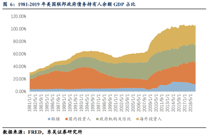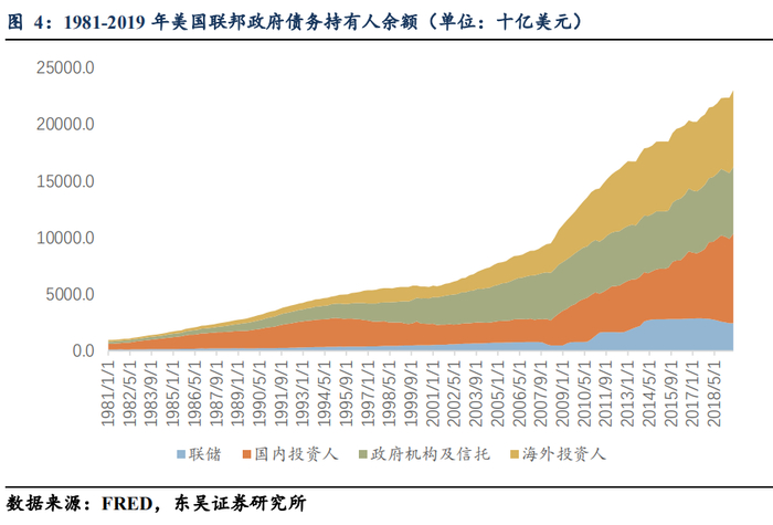 (4)另外,如下图所示,联邦政府债务持有人中包含政府机构及信托,主要是社保信托基金(social security trust funds),2019年三季度规模约为5.9万亿,对GDP比27.36%,但这一部分债务本质上是政府拖欠政府自己的债务;另外,联邦政府债务持有人中包含联邦储备银行,2019年三季度规模约为2.4万亿,对GDP比11.31%,由于联储需要退还(remit)一切利润给财政部,因此任何持有债务的利息也将返还(rebate)给财政部,因此这一部分本质上同样是政府拖欠政府自己的债务。从总量上扣除了名义上对政府机构及信托,以及联储的债务后,本质上联邦政府债务规模将从23.1万亿下降到14.7万亿美元,对GDP比也从106.88%下降到68.22%。