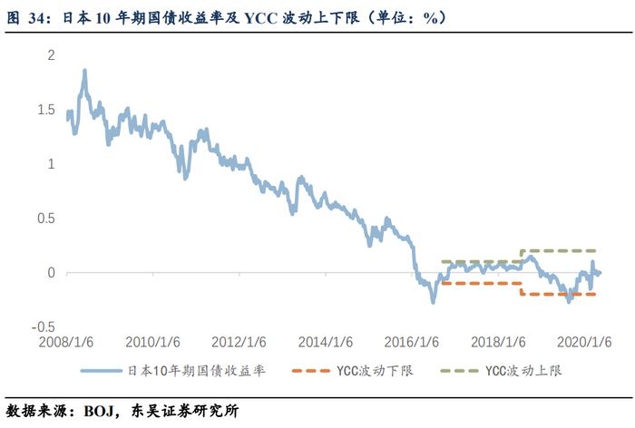 我们可以看到日央行的一种折中的方案,即扩大YCC波动上下限。日本央行将10年期国债收益率锚定在零水平,从2016年9月至2018年7月容忍波动幅度为+/-0.1%;从2018年7月起容忍波动幅度扩大到+/-0.2%。从图中可以看大,两次容忍波动幅度的设计思路显然不太相同:第一次是为了防止10年期国债收益率过快下跌,为了配合NIRP维持金融体系一定的盈利能力,修复收益率曲线形态;而第二次则为了允许10年期国债收益率突破+0.1%波动上限,日本央行乐见这一收益率水平在不是因为市场恐慌时出现上升,而是通胀预期回升、经济增长预期回升的环境中出现上升,日央行随即“适应(accommodate)”了这一市场定价水平。