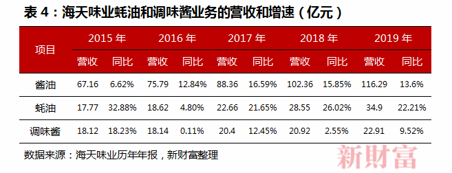海天味业的另外两个主要业务,蚝油和调味酱,收入也保持着较高速度的增长,尤其是蚝油(表4)。