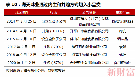 近年来,海天开始实施产品多元化战略,涵盖醋、鸡精、味精、料酒、腐乳等品类,并于2017年、2020年分别入股丹和醋业、合肥燕庄(表10)。