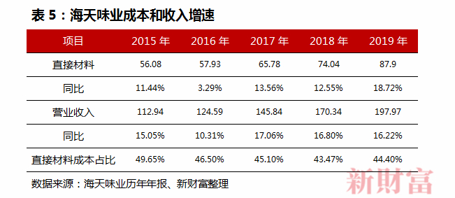 不过,2019年海天的直接材料成本增速首次超过营收增速,公司解释为采购成本上升,蚝油销售量同比增长较快,蚝油产品各项成本较高所致。