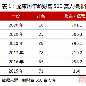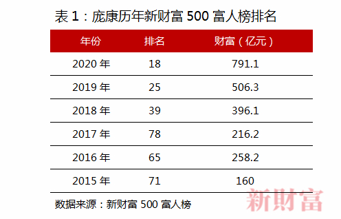 2014年海天上市首日,至少有32名自然人股东成为亿万富翁。次年,庞康凭借160亿元财富首次进入新财富500富人榜,排名第71位,随后几年,他的名次不断提升,2020年以791亿元跻身中国最富20人之列(表1)。