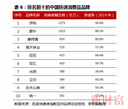 凯度消费者指数在2019年6月发布的亚洲品牌足迹报告上,海天味业以5.2亿消费者触及数、73.3%的渗透率,位列中国快速消费品品牌第4名,成为榜单前10中唯一的调味品企业(表6)。