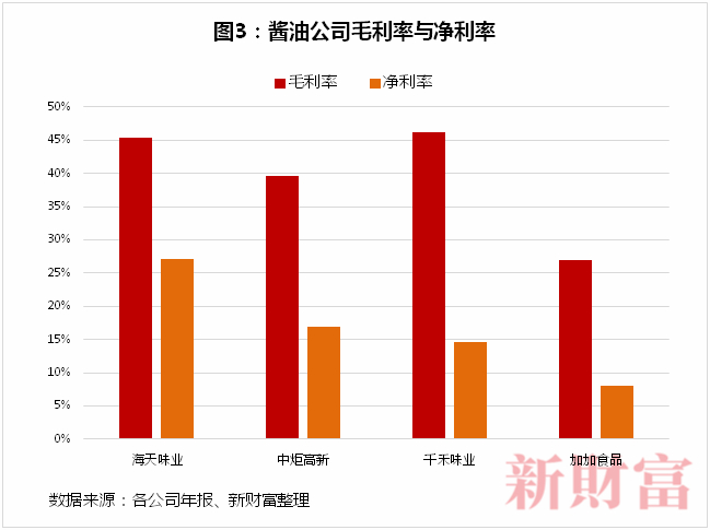 正因为如此,海天的酱油产品即使价位低于厨邦和千禾,综合毛利率仍高于后两者。2019年海天的综合毛利率为45.44%,中炬高新为39.55%,千禾味业46.21%。