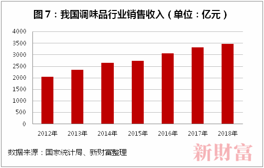 根据国家统计局数据,2003-2012年,调味品行业的复合增速达到20%,为高速成长期;2012-2018年间年复合增长率为8.5%,行业进入成长期的中速阶段,2018年我国“调味品和发酵制品”销售收入为3427.2亿元,同比增长10.6%(图6)。
