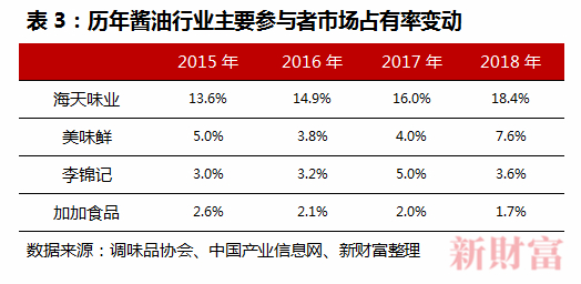 过去30年间,调味品行业发生了较大的市场变动。今天,在中国的每一个地级市里,都已有海天的身影。酱油行业中,曾经的龙头加加酱油日渐颓落,而新的老大海天则独领风骚。其市场份额从2015年的13.6%上升到2018年的18.4%,提升了近5个点;而同期美味鲜、李锦记分别只提升了2.6、0.6个百分点。曾经的酱油第一股加加酱油,份额更是一路下降,根据调味品协会的数据,其2018年份额只有1.7%(表3)