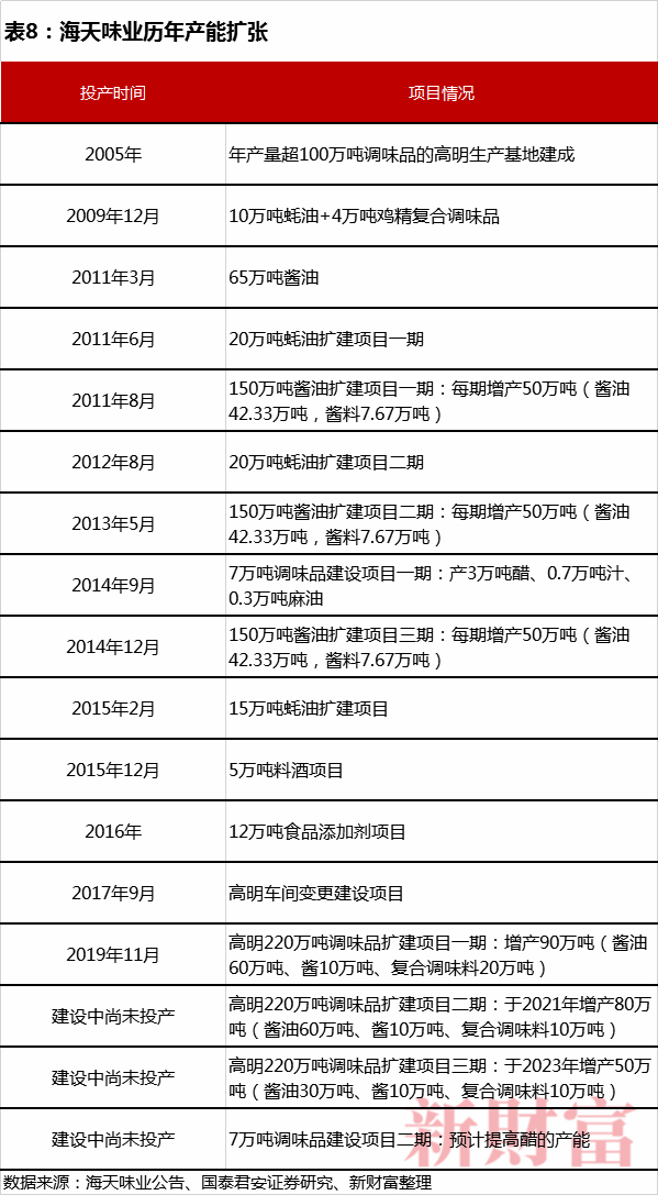 2005年广东高明生产基地建成,是海天味业产能逐渐扩张的起点,从2009年至今,海天不仅在酱油、蚝油、调味酱领域进行扩产,也开始不断加码小品类调味品的产能建设(表8)。