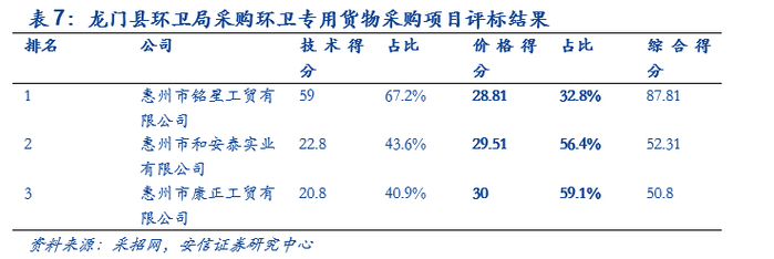 2016年8月9日,龙门县环卫局采购环卫专用货物采购项目发布综合评分法中标公告,采购预算为599,400元,可以看到排名第一的公司价格得分占比只有32.8%,并不是三个企业中最高的,技术得分占比67.2%,为三个企业中最高的,说明环卫市场趋向良性竞争。